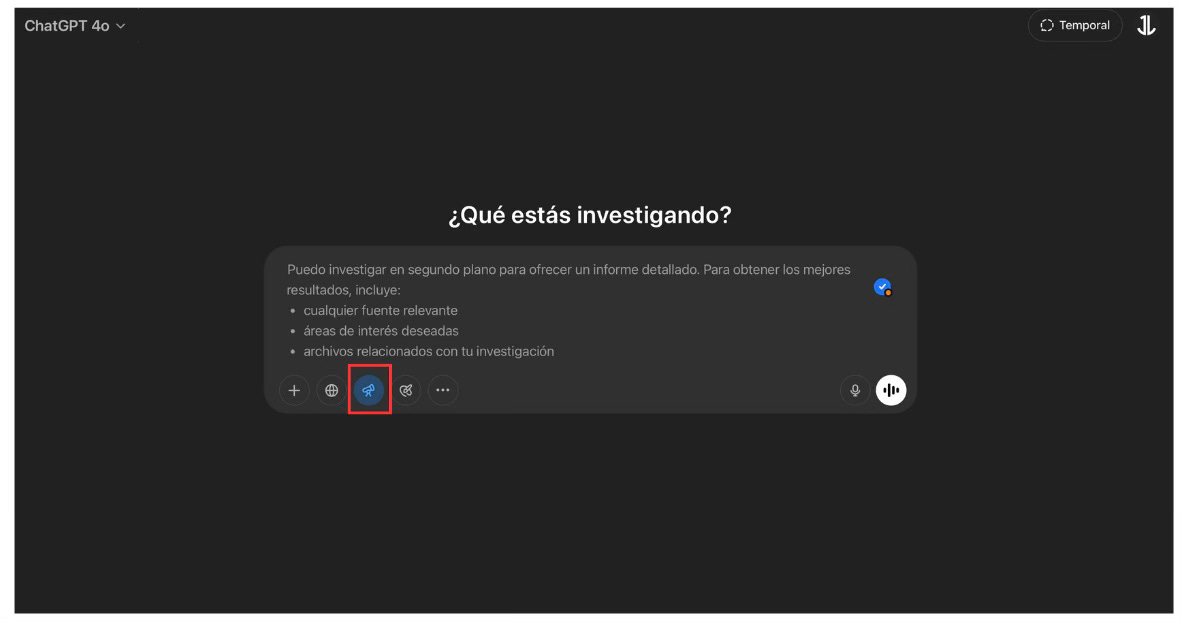 Deep Research es una función integrada en la IA que, como su propio nombre indica, te permite realizar investigaciones profundas sobre cualquier tema directamente desde la interfaz del chat.